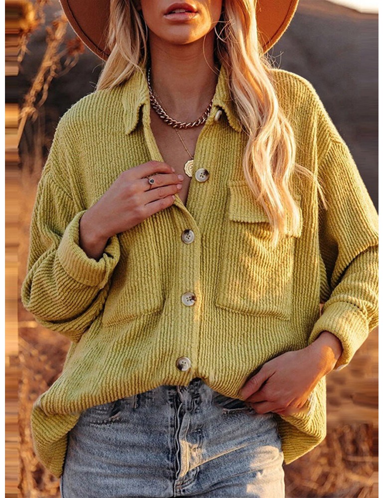Women Solid Corduroy Button Chest Pocket Long Sleeve Casual Shirt